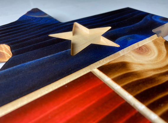 This is a beautiful wooden Texas Shaped, Texas Flag made in Argyle, Texas. This is burned in order to have the grain pop then stained, carved and finished with a gloss. Wonderful addition to any room in the house, from a bedroom to an entryway. Each board is hand selected in order to have the best grain pop and no single flag is identical, each is unique in its own special way! A lot of effort goes into every flag and quality is my number one priority. Dimensions are approximately 11.25 wide by 11 high and .7 deep. There is keyhole slots on the back in order to hang on the wall. Additionally, there is a copper plaque on the back with the product number and TX Carver.